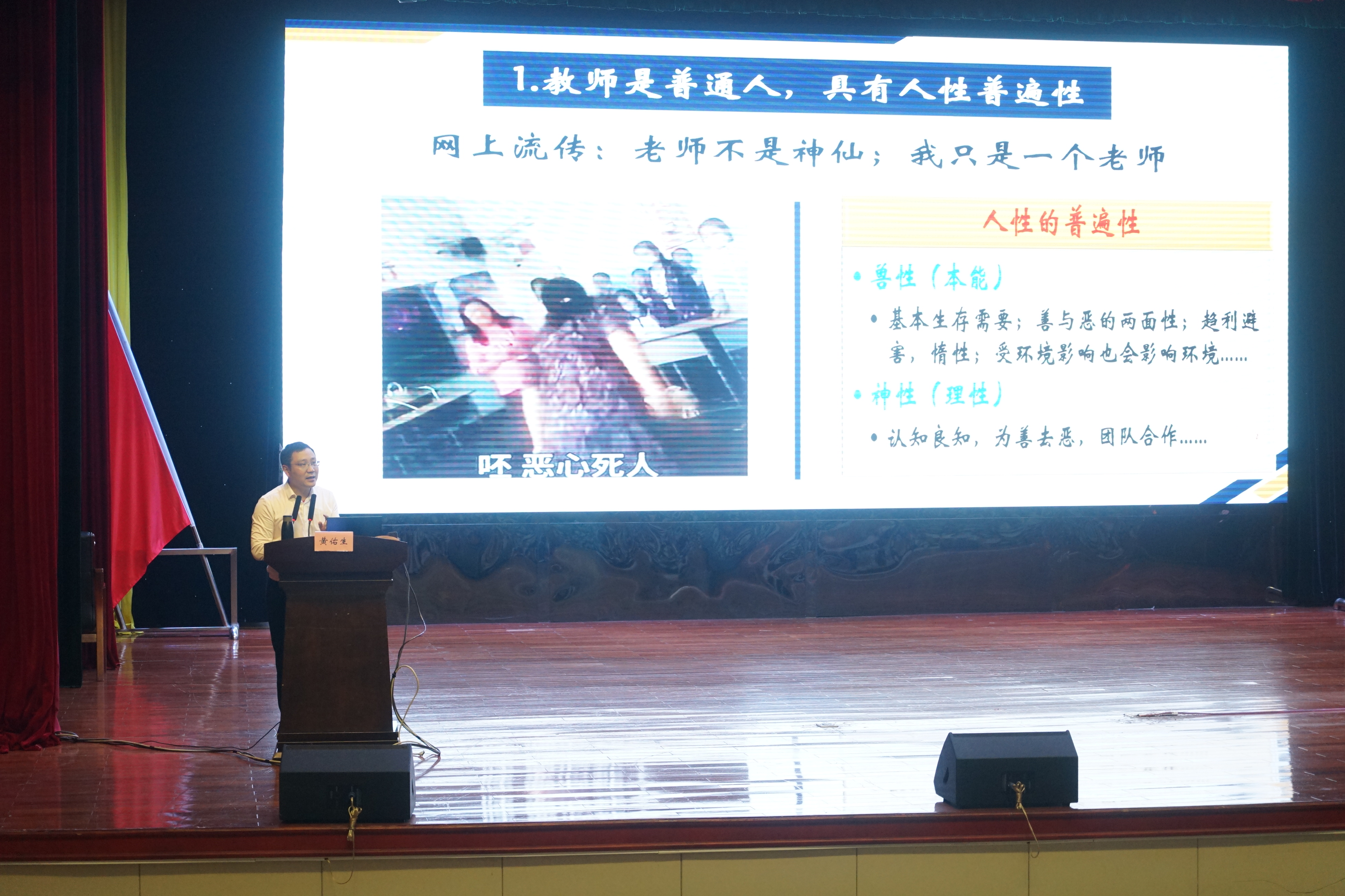 黄佑生以"走向幸福的师德修养"为主题为大家带来了一场精彩的师德教育讲座。他以近年来发生的师德师风案例和身边的师德楷模告诉大家,"教育是优秀的人培养更优秀的人,是幸福的人感染更幸福的人",要追求做"阳光健康,身心好;工作出色,工作好;家庭美满,家庭好;生活品味,生活好"的"四好"老师。要守住底线、常怀敬畏,做种福的教育,做种福的良师。