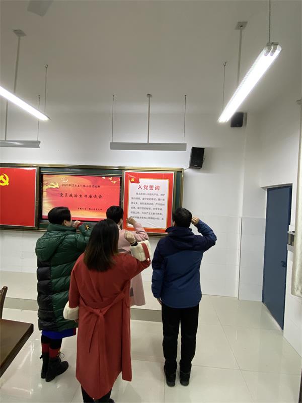 活动中,该校支委组织委员汪秋萍带领全体支委、党小组长及12月份过政治生日的三位党员重温入党誓词。面对鲜红的旗帜,党员们举起右手、紧握拳头,庄严宣誓。随着一声声“我志愿加入中国共产党,拥护党的纲领,遵守党的章程……”铿锵的誓词,让在场的每一位党员都得到了精神的洗礼和党性的锤炼。