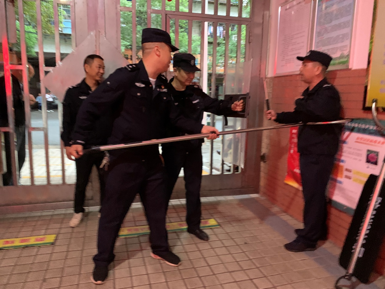 随后,警官们对学校环境进行了细心地巡查,对学校的安全工作进行了细致地指导,特别指导了保安人员正确使用警用器械,强调保安人员做好来访人员登记盘查、上放学维持校门口秩序等日常工作。
