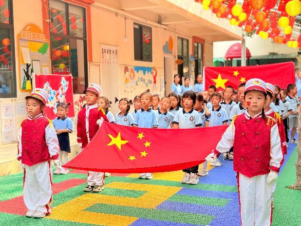 西湖幼儿园以"颂祖国"为主题,通过"手印绘中国"让孩子用五彩手印勾勒中国地图,组织大班幼儿担任护旗手完成升旗仪式,还开展"红歌大比拼"传唱经典红歌、齐颂《我是中国娃》等活动,将爱国主义教育融入幼儿可感知的情境,在厚植家国情怀的同时,推动"五育"融合落地。