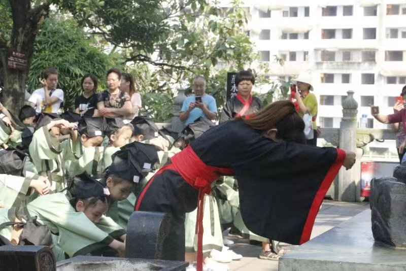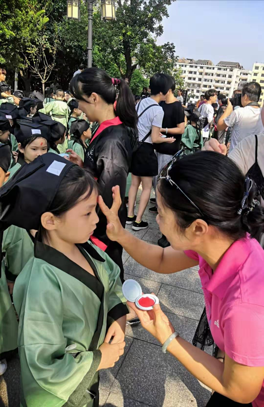 活动依次进行了行拜师礼、点朱砂“智”、诵《弟子规》和游石鼓山四项。50名学生在石鼓区图书馆工作人员带领下今天第一次游览了闻名遐迩的石鼓书院,分别在禹碑亭、合江亭、武侯祠、朱陵洞和大观楼前游学打卡。行走在三面环水的石鼓山上,远眺滔滔江水、来雁塔和青草桥,学生们不禁跟随老师大声吟诵“朱陵洞内诗千首”“青草桥头酒百家”“石鼓江山锦绣华”等诗句……引得过往游客一片称赞。