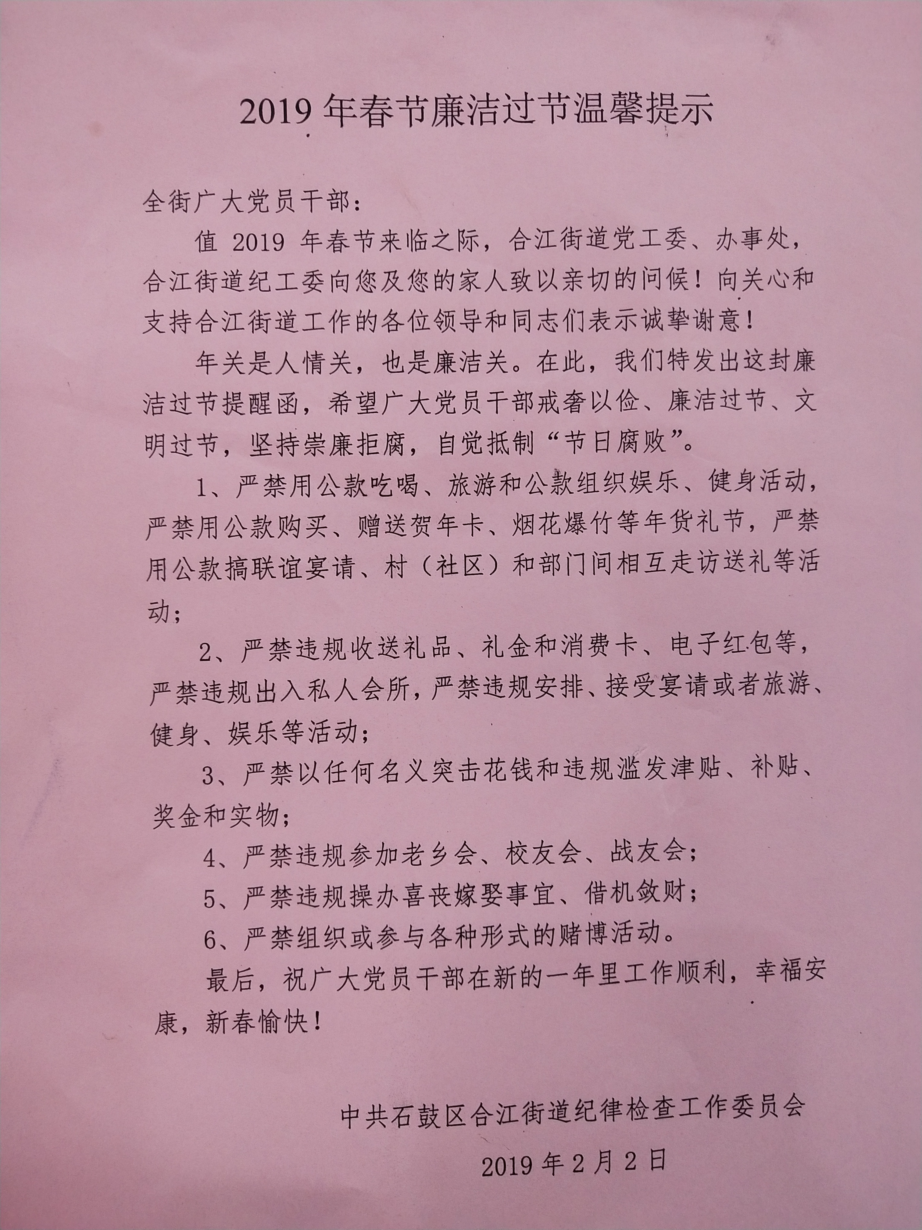为进一步加强春节期间工作纪律和生活纪律,强化全街党员干部的廉洁自律意识,合江街道开展了“廉洁过春节”活动,确保广大党员干部在春节期间加强廉洁自律意识,筑牢拒腐防变堤坝。