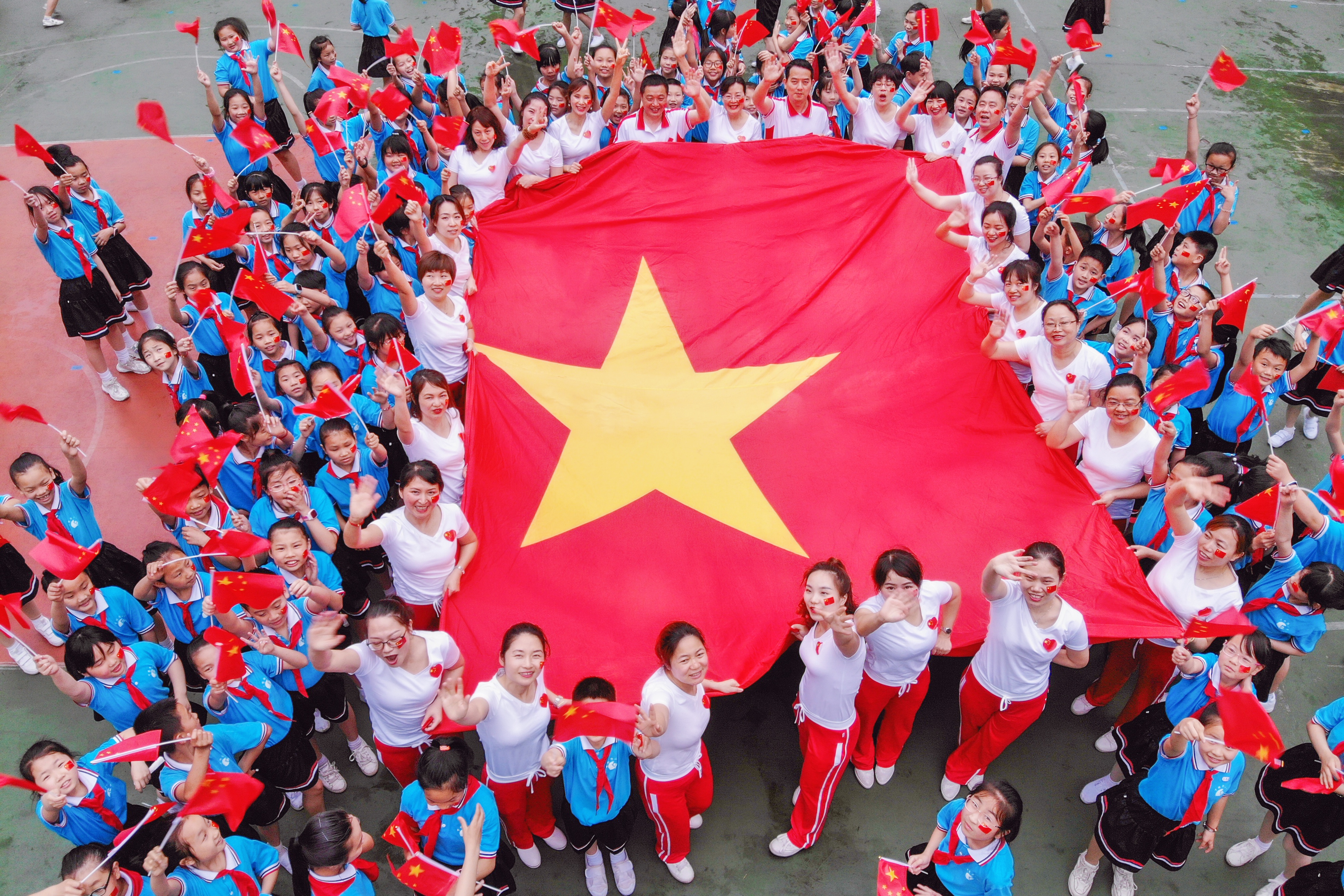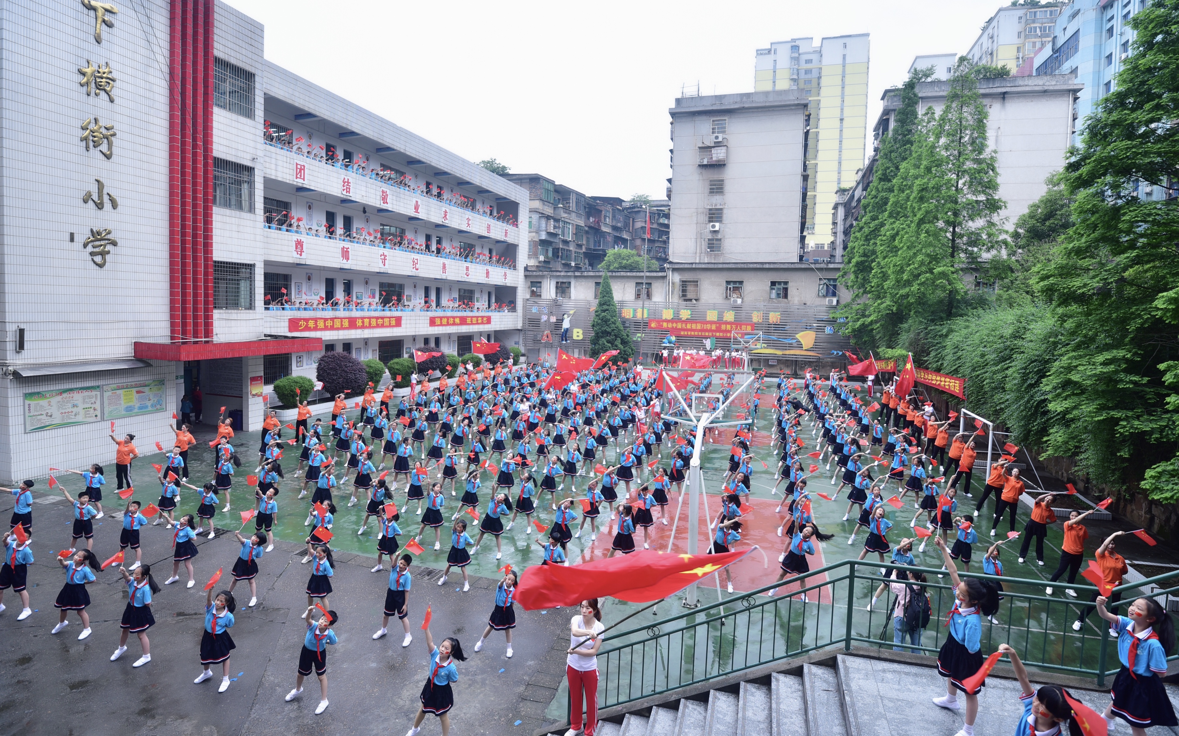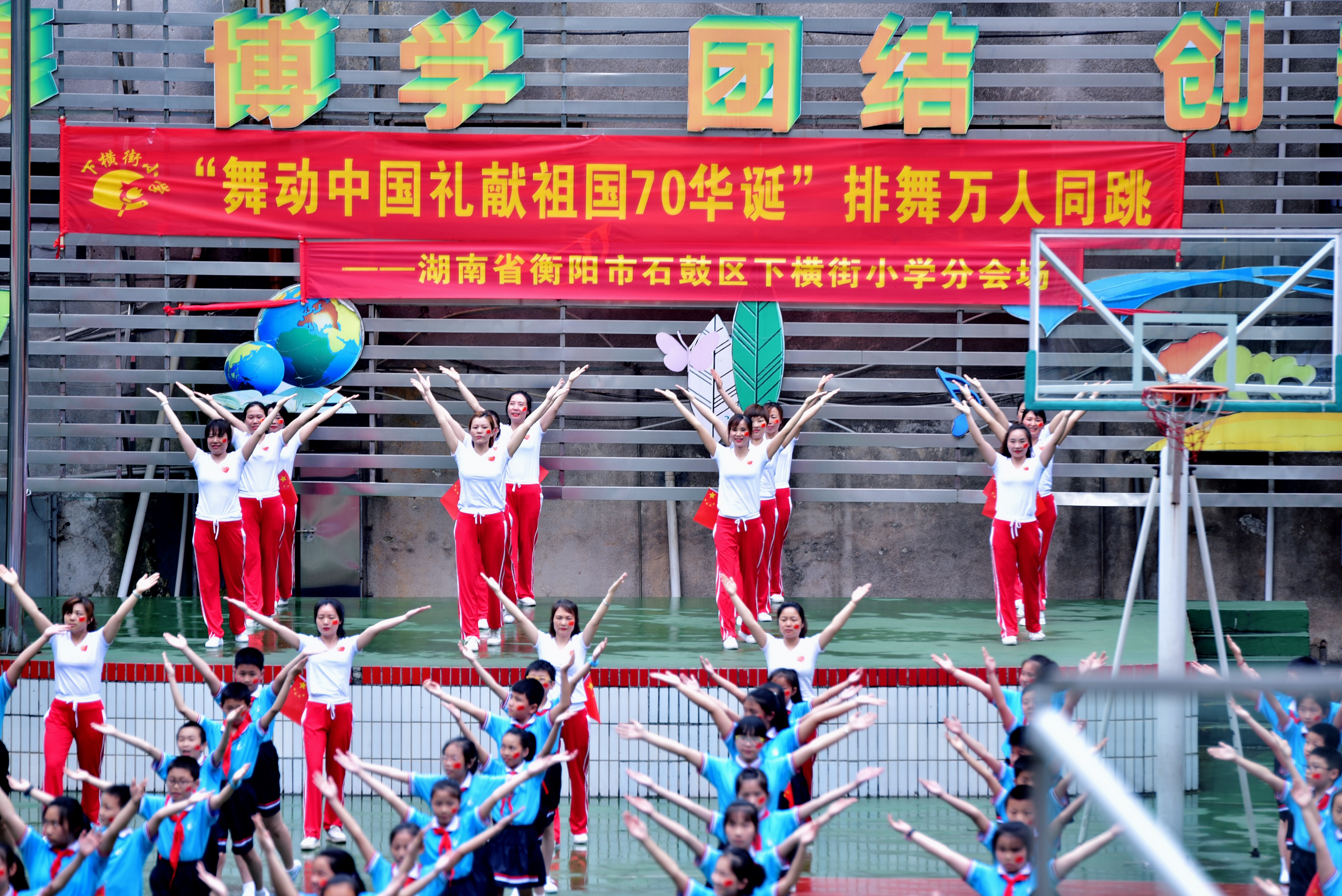1000名小学生身着整齐而精神的天蓝色校服,全校47名教师穿着火红的中国红排舞服,36位家长代表,在祖国的碧水蓝天下跳起了《舞动中国》、《我和我的祖国》,老师、学生、家长携手并肩欢舞在校园的每一寸土地,每一个角落!他们把激情与梦想融入到排舞表演中,他们用“动感和靓丽舞姿”跳出下横人新时代进取的风采!当鲜艳的五星红旗从舞台上飘来,铺满大半个操场时,在场的每一个中华儿女情不自禁地发出“祖国万岁,我爱你中国”的欢呼!