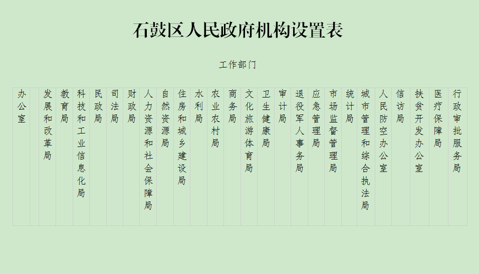 石鼓区人民政府设置机构26个。办公室加挂政府金融工作办公室牌子;应急管理局加挂防汛抗旱指挥部办公室牌子。市公安局石鼓分局为市公安局派出机构,计入区政府机构限额,不列入区政府工作部门。