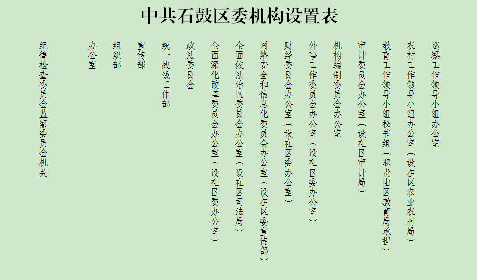 中共石鼓区委设置纪检监察机关1个,计入机构限额的工作机关7个(设在相关部门的议事协调机构的办事机构不计入机构限额)。其中,纪律检查委员会与监察委员会合署办公,实行一套工作机构、两个机关名称;办公室加挂直属机关工作委员会、档案局牌子;组织部加挂非公有制经济组织和社会组织工作委员会、老干部局、公务员局牌子;宣传部加挂精神文明建设指导委员会办公室、互联网信息办公室牌子;统战部加挂民族宗教事务局牌子。