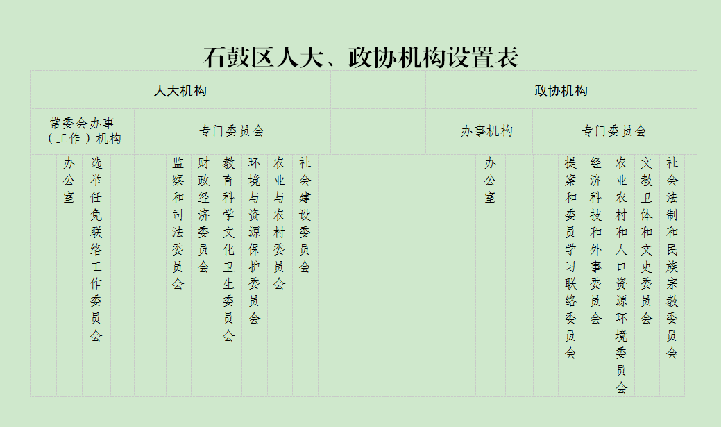 区人大常委会办公室加挂研究室、信访室牌子;人大民族华侨外事委员会与教育科学文化卫生委员会合署办公;人大法制委员会与监察和司法委员会合署办公;人大常委会预算工作委员会与人大财政经济委员会合署办公。