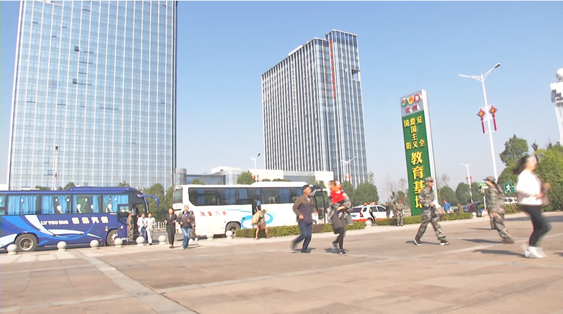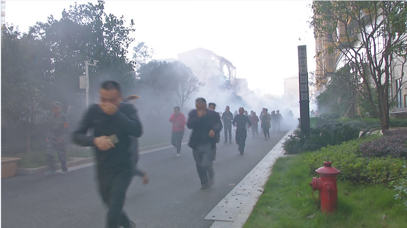情景一:11月1日上午9点30分,一声急促的防空警报声响彻石鼓区五一街道望城路社区的湖景水岸小区,紧接着,“现在遭遇空袭,请居民迅速疏散至小区大巴,我们将带大家前往虎形山人防疏散基地……”现场指挥长发出指令,居民马上关闭家中燃气、门窗,切断电源、自来水,跑出家门,穿过滚滚浓烟,在现场人防工作人员指引下有序撤离到大巴车。大巴车在人防指挥通信车的带领下,将居民护送到虎形山人防疏散基地。