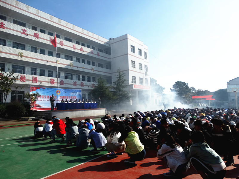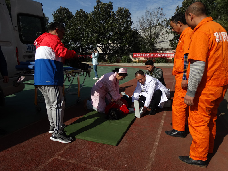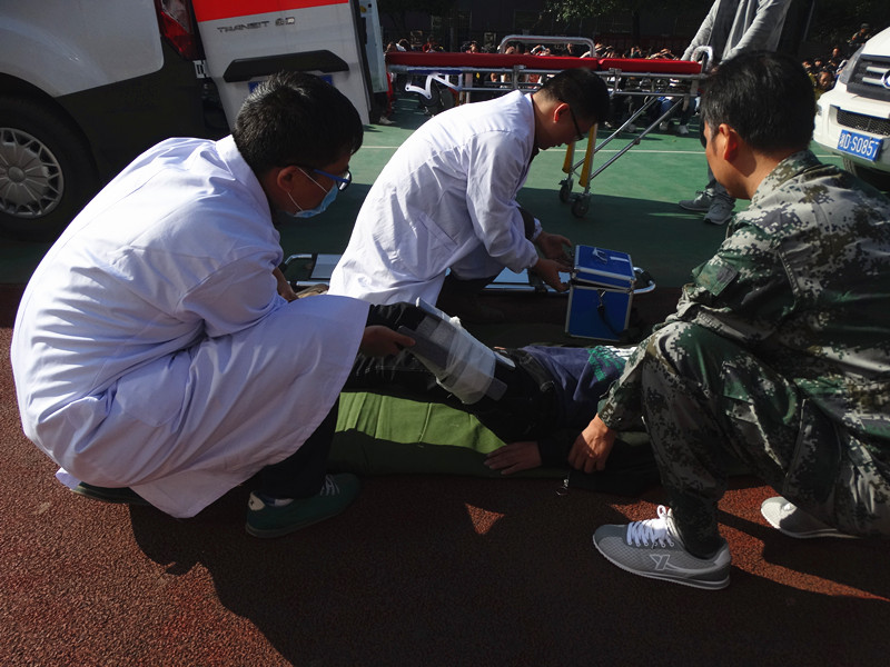 情景二:石鼓区角山中学朗朗书声、生机盎然。也就是同时刻,防空警报声拉响,师生们放下手中的书本,开始了紧急疏散。伴着阵阵呛鼻的浓烟,500余名学生捂鼻、弯腰、抱头,紧靠墙体小步快走,在教师及人防工作人员的指引下迅速地穿过浓烟区,紧张有序地撤离到操场。“不幸”的是,四名学生意外受伤,医疗救护专业队在收到现场总指挥的救援信号,立即赶往学校操场,对现场受伤的四名学生分别进行了包扎止血、骨折固定、心脏复苏、伤员搬运等医疗救助。整个过程历时不到5分钟。