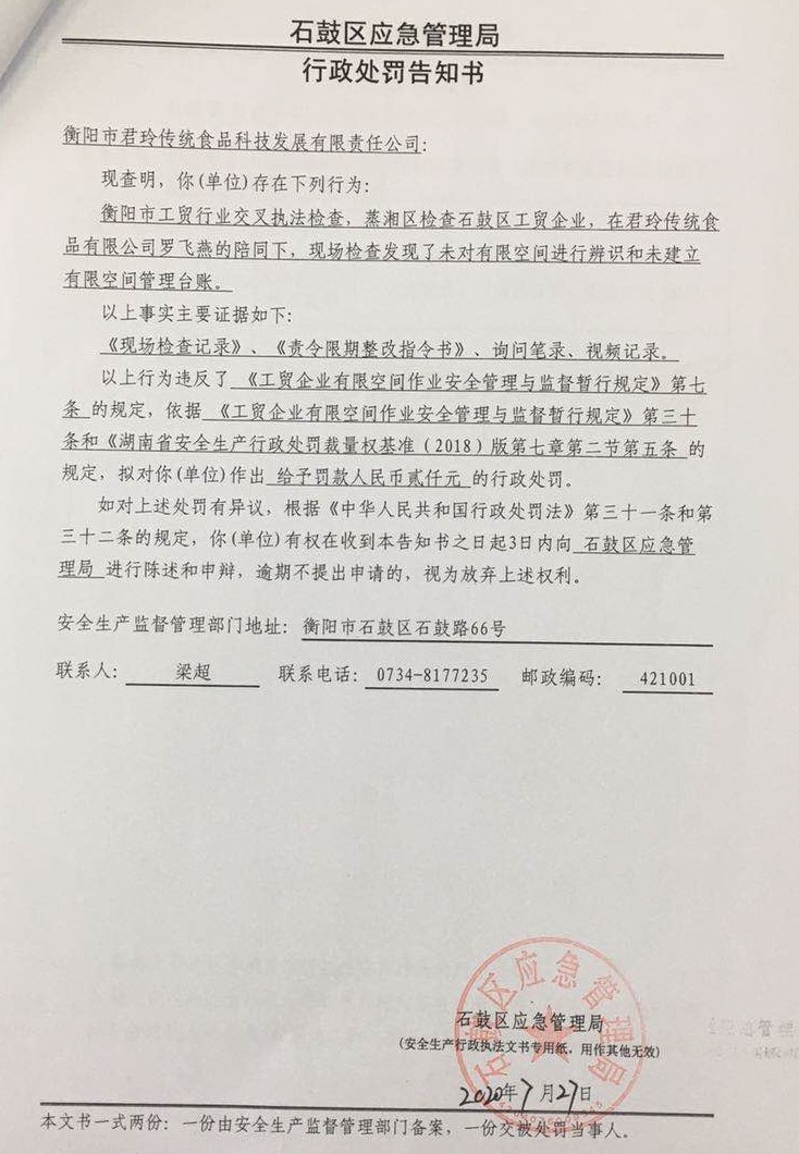 衡阳市君玲传统食品科技发展有限责任公司安全生产行政处罚决定