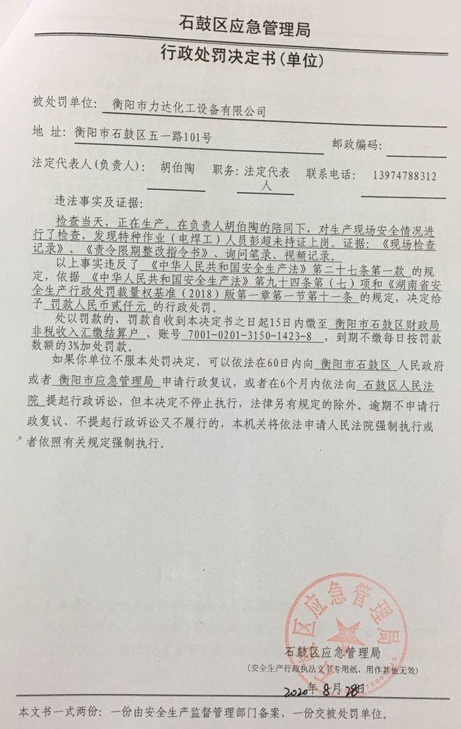 衡阳市力达化工设备有限公司安全生产行政处罚决定