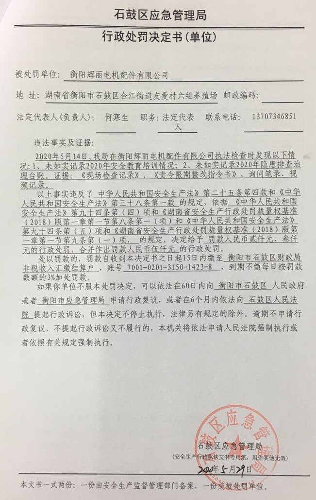 衡阳辉丽电机配件有限公司安全生产行政处罚决定