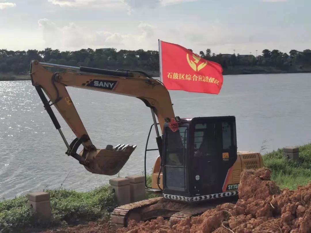 另一旁,石鼓区人武部官兵在2台大型挖掘机的配合下正在对河堤进行紧急加固。通过演练,进一步检验了我区综合应急救援力量在抢险救灾时的组织动员、快速反应、协调保障能力.