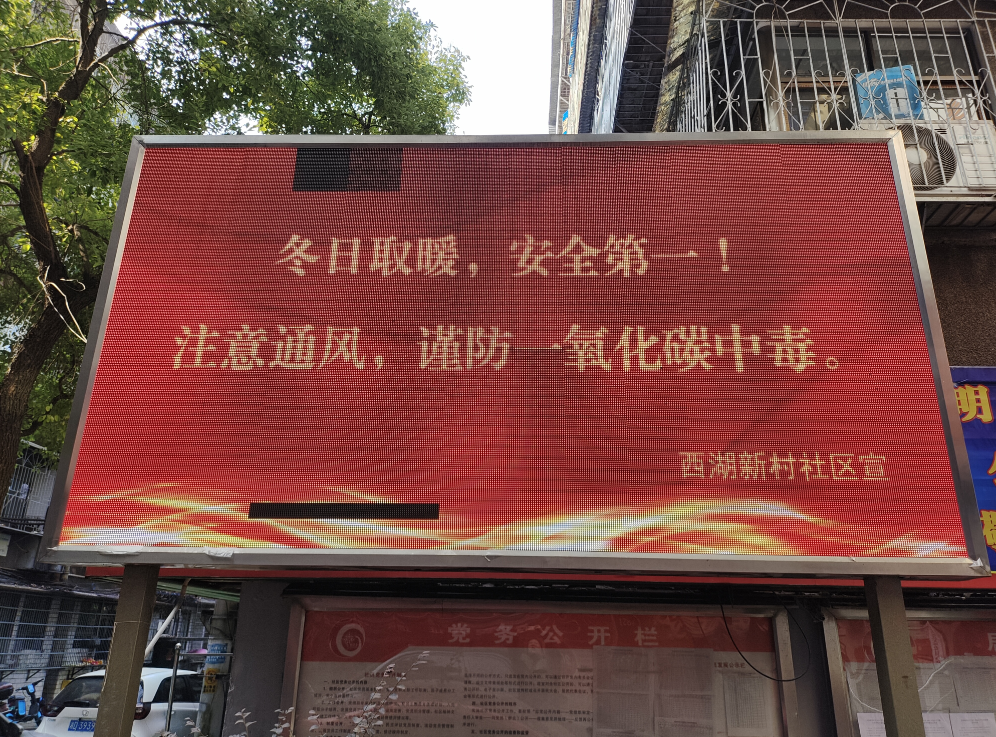 时值岁末年初,西湖新村社区充分利用LED电子显示屏、居民微信群、夜间巡逻广播等多种媒介全方位宣传安全用火用电用气,增强居民安全防范意识。