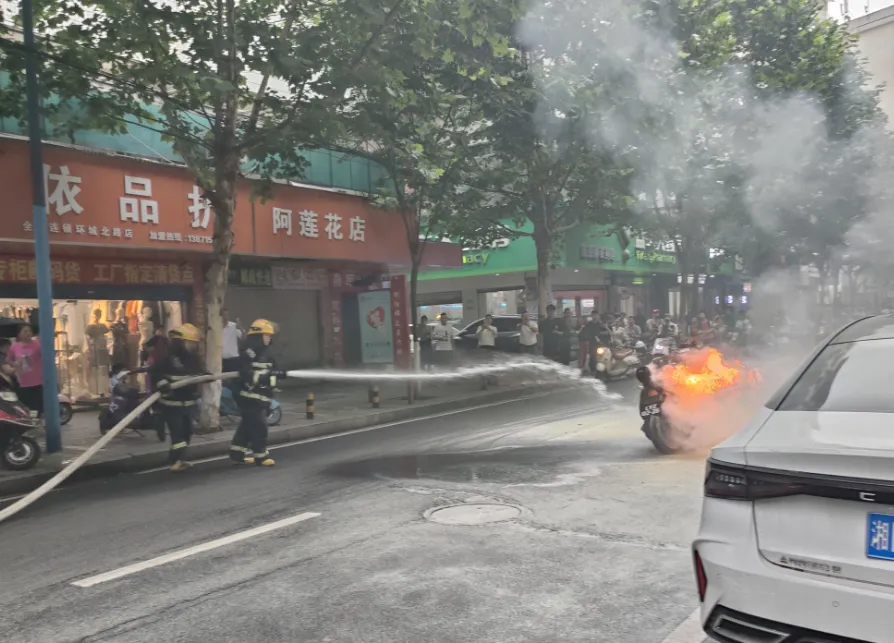 据了解,使用干粉灭火器之后,明火随即被扑灭,谁料马上又复燃了。关键时刻,消防队员们赶到现场进行扑救。经过水枪的强力压制,再对电池进行水浸降温后,危险终于被解除了。