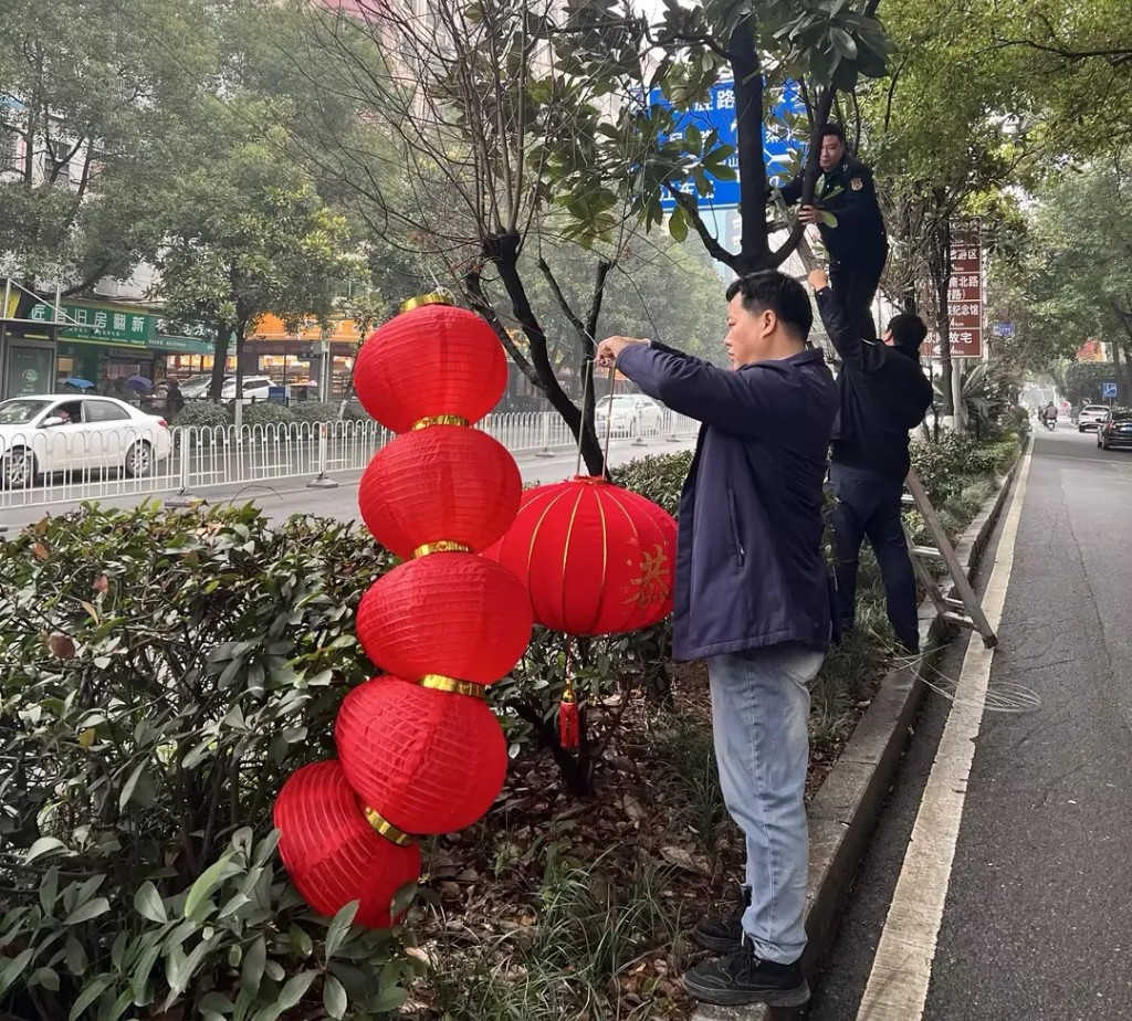 为营造喜庆祥和的节日氛围,街道充分利用社区LED屏、宣传栏及线上平台,推送新春祝福与文明过节提示。各社区联合物业小区、辖区单位,在主次干道、背街小巷、小区出入口悬挂灯笼、张贴春联,为沿街商户送上“上门送福”服务,让街区处处洋溢着浓郁年味。同时,开展节前环境卫生大扫除,党员干部、志愿者和居民代表齐上阵,全面清理楼栋楼道、绿化带和卫生死角,规范非机动车停放,以干净整洁的面貌迎接新春。志愿者们还走街串巷倡导移风易俗、安全出行,引导居民文明过年。