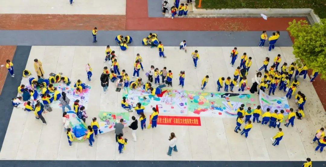 与之交相辉映的,是广场上如火如荼的“未来共创”巨画活动。一幅36平方米的空白画布静待描绘。在美术辅导老师和学校教师的指导下,各班同学分工协作,调色、勾线、涂色,将参观所得的灵感与对未来的遐想,转化为笔下的线条与色彩。个人的巧思融汇成集体的创意,美育的种子在协作中萌发。