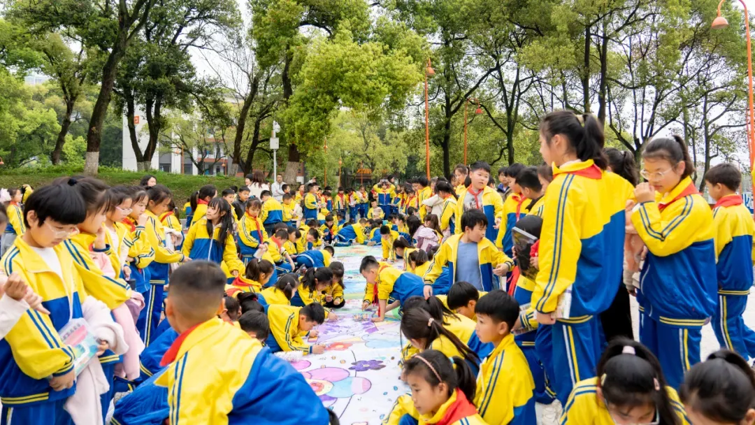 分散创作的九块画布被精心拼接,一幅主题鲜明、充满想象力的巨型画作完整呈现。全体师生围绕这幅共同完成的美育成果,留下了洋溢着成就感与喜悦的珍贵合影。