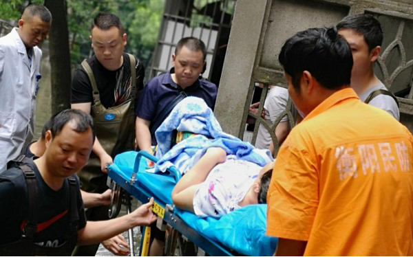 望城路社区的党员志愿者们为了群众的生命和财产安全迎着风,冒着雨,以最强的执行力奋战在抗洪抢险一线。石鼓区五一路67号6栋片区的救灾人员忽然听到2单元503户钟先生的求救喊声。原来他80多岁的母亲早上摔断了髋关节在床上动弹不得,?望城路社区党员志愿者立马抬来担架,然后与五一街道民兵应急小分队的4名队员一起到居民家中。在医生的指导下,大家齐心协力将钟奶奶转运到担架上,顺利抬上救护车。这个小区此时最深的水位已经达到1.3米,从钟奶奶家到救护车的距离有500米,尽管艰难,但是救灾人员不怕苦不怕累,积极开展救援工作。