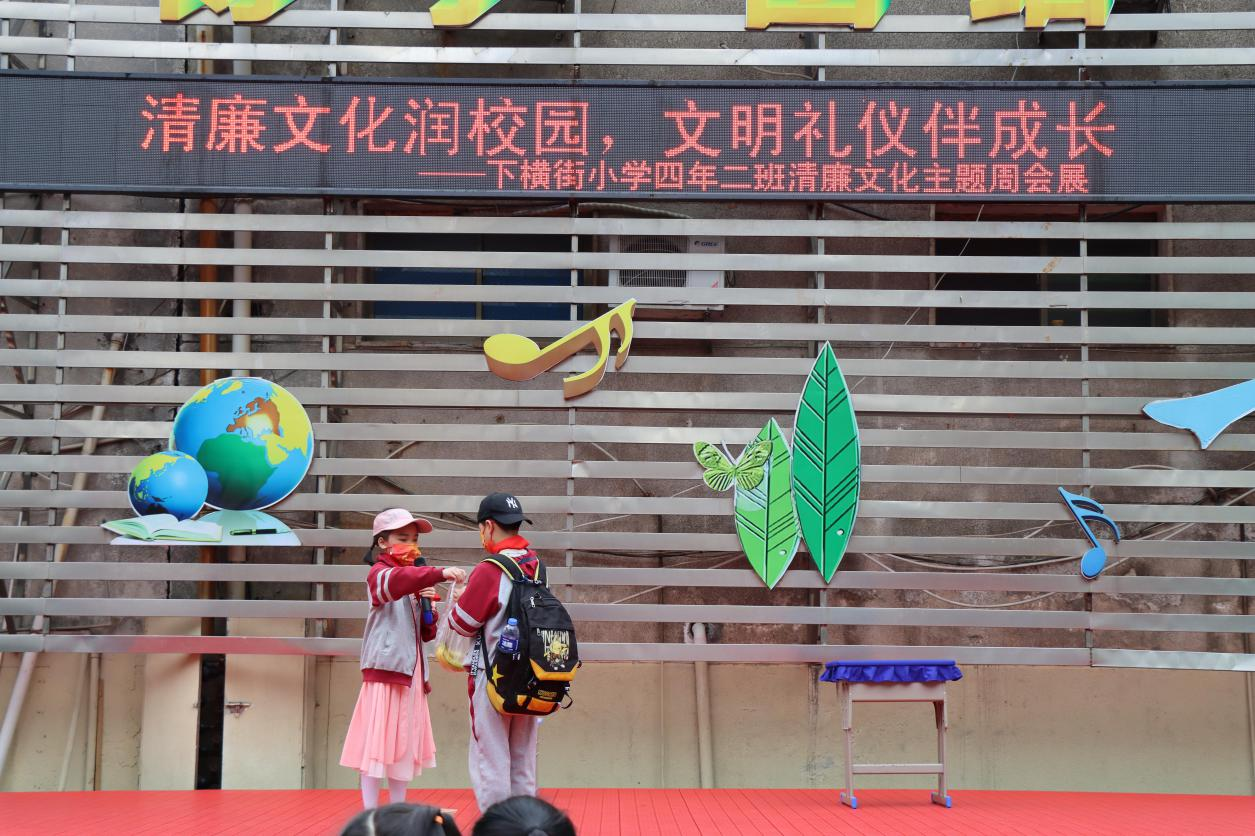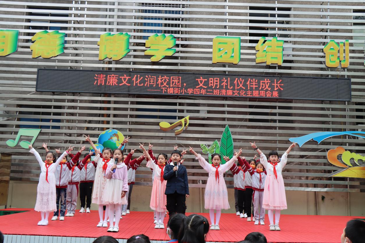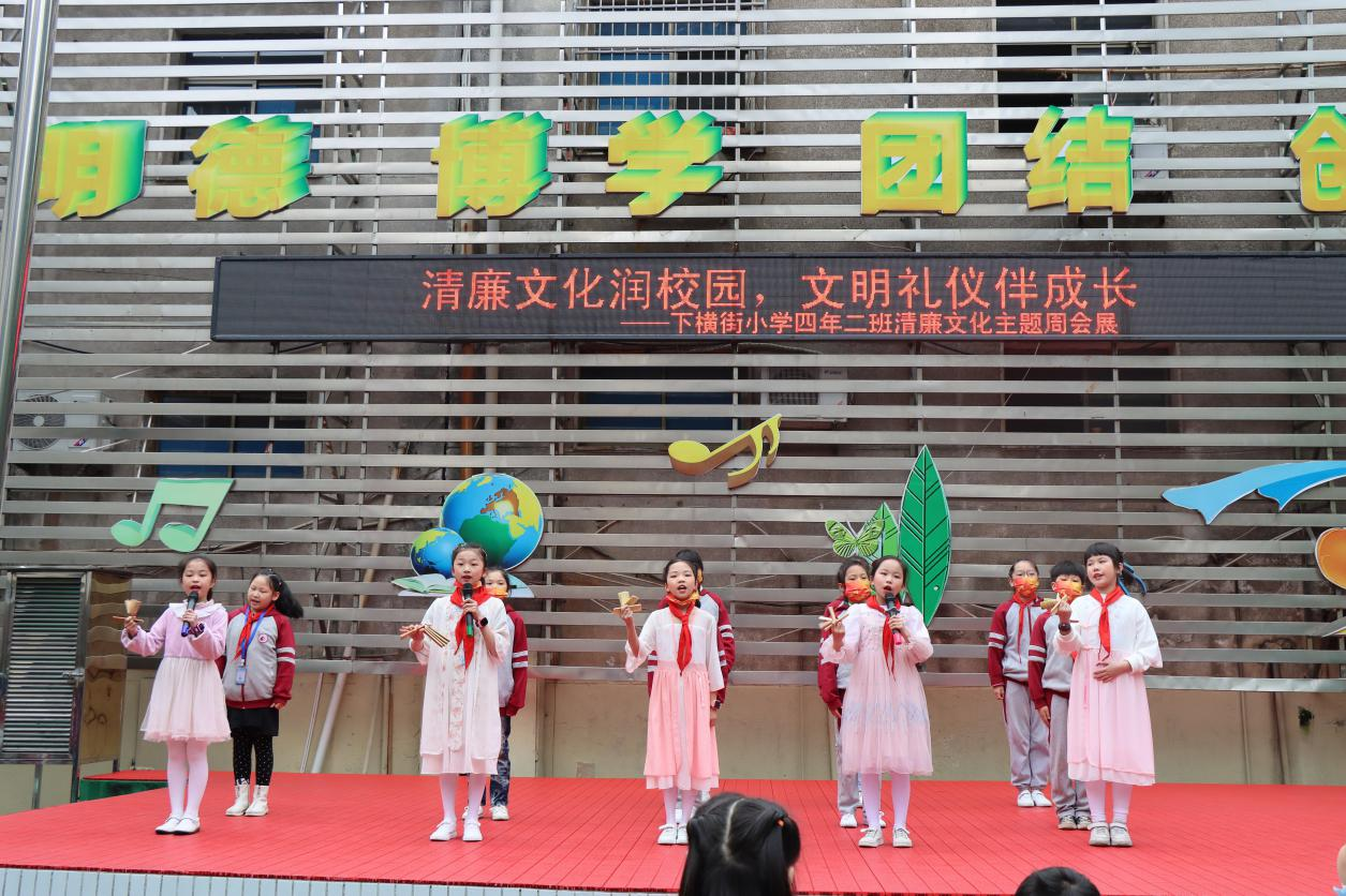 4月18日,下横街小学四年二班的学生早早来到学校舞台上,将一场精心准备的清廉文化主题周会展现给全校师生,让师生们激起对清廉文化的由衷赞美,感受到了清廉于国于民的重要性。