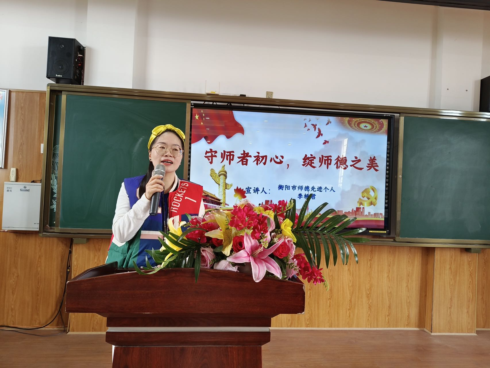 活动在学校多媒体室举行,由衡阳市师德先进个人李艳君老师主讲。李艳君老师以播放精美的PPT和演讲汇报结合的方式进行,她结合自己的工作情况,以生动的事例、真挚的情感、质朴的语言讲述了她对教育事业的深刻理解和执着追求,在场的老师认真聆听着她的教育生涯中的感人事迹:李艳君老师从教27年以来,始终奋斗在教学第一线,不忘“教书育人”之初心,铭记“立德树人”之使命,勤勤恳恳,忘我工作。多少次风里来雨里去,她从不随意请假、迟到,也从不落下一节课。她尽职尽责,上好每一堂课,不求回报,用实际行动诠释着教师所持有的内涵——敬业、爱生、奉献。
