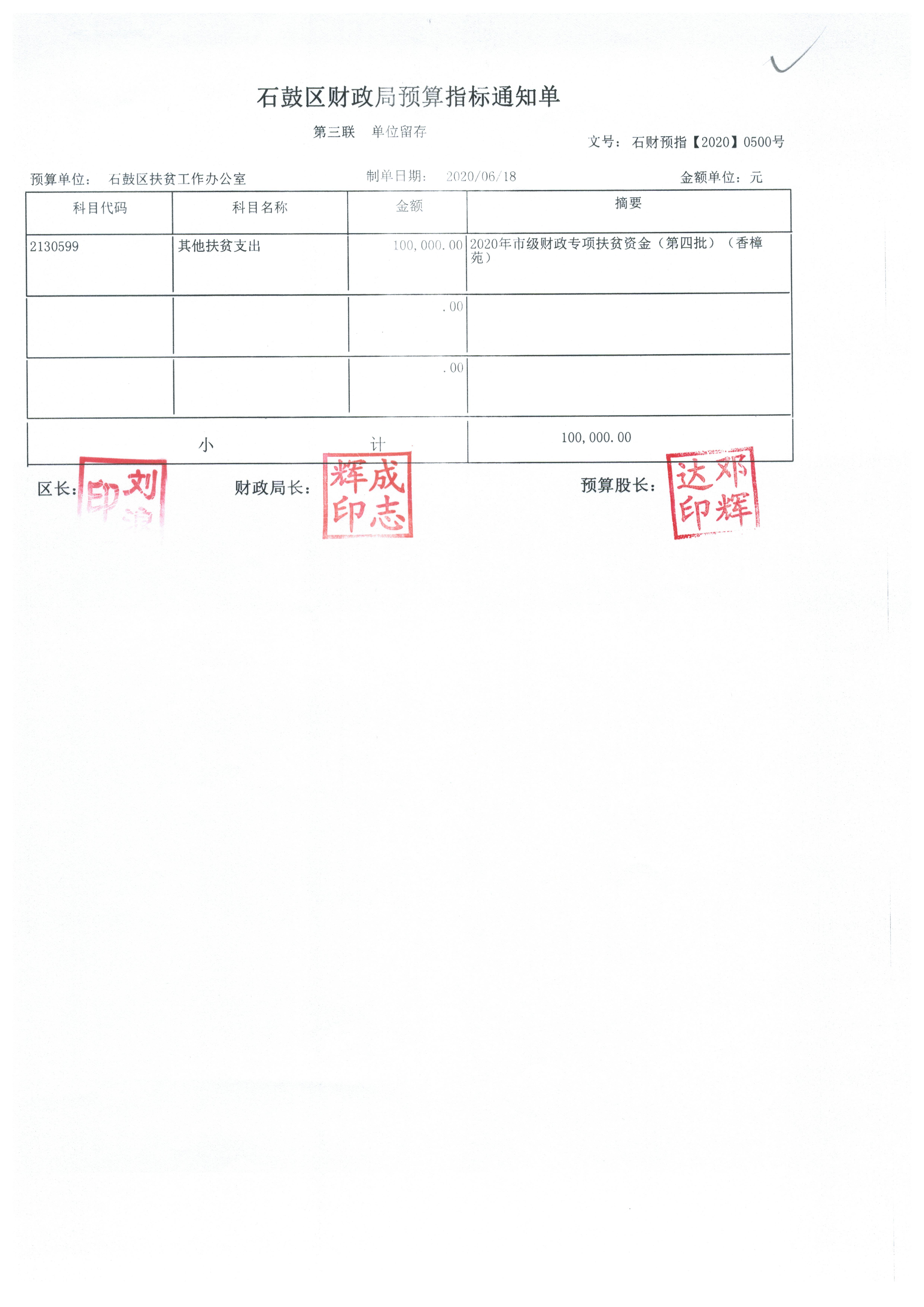 根据衡财农指[2020]99号文件精神,报经区领导核批,特下达区扶贫办2020年市级财政专项扶贫资金(第四批)用于衡阳香樟苑生态农业发展科技有限公司产业发展,详见附件。