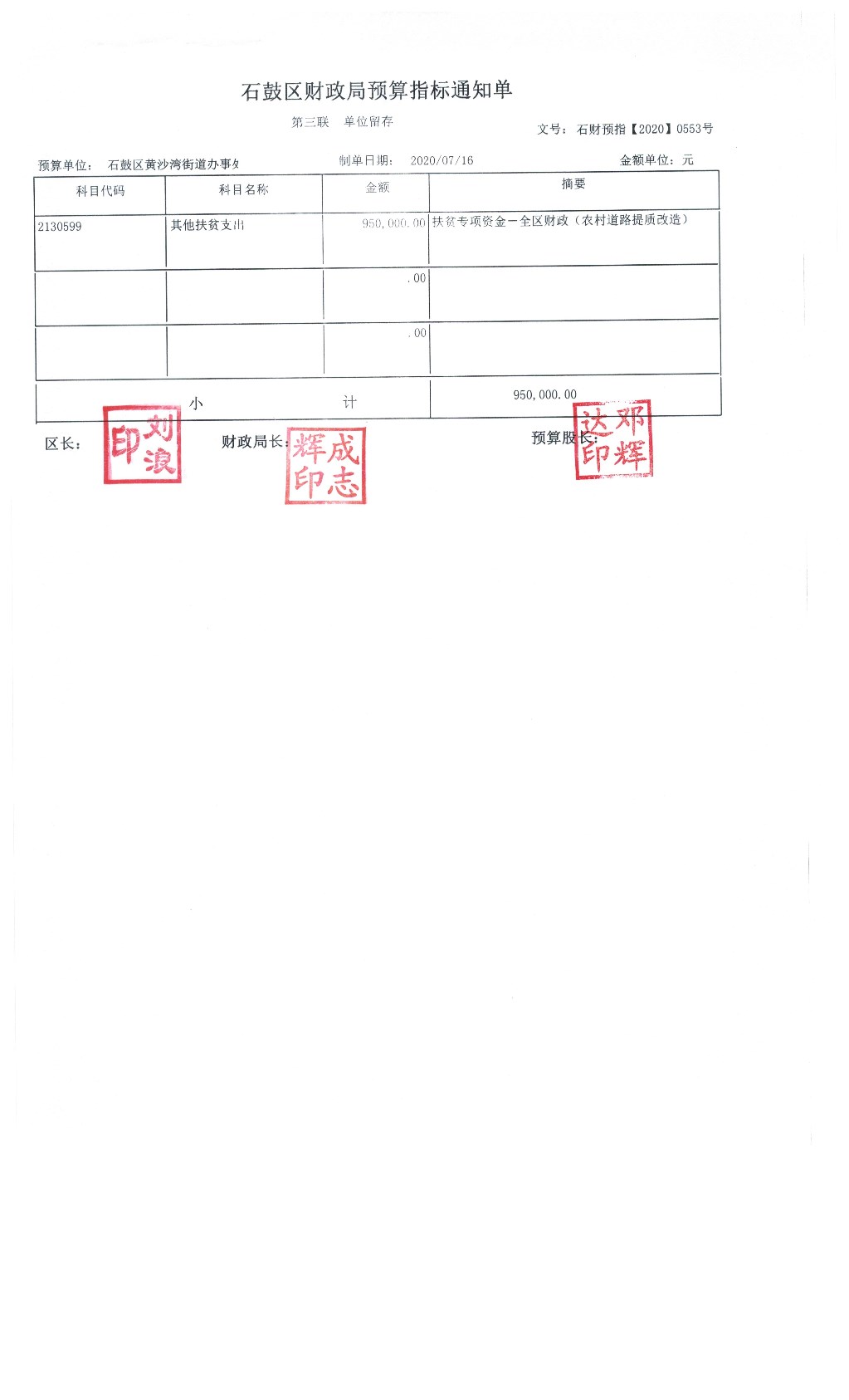 经黄沙湾街道申请,报区领导同意,现拨付95万元用于乡村旅游环线建设,不得挪作他用。详见附件。