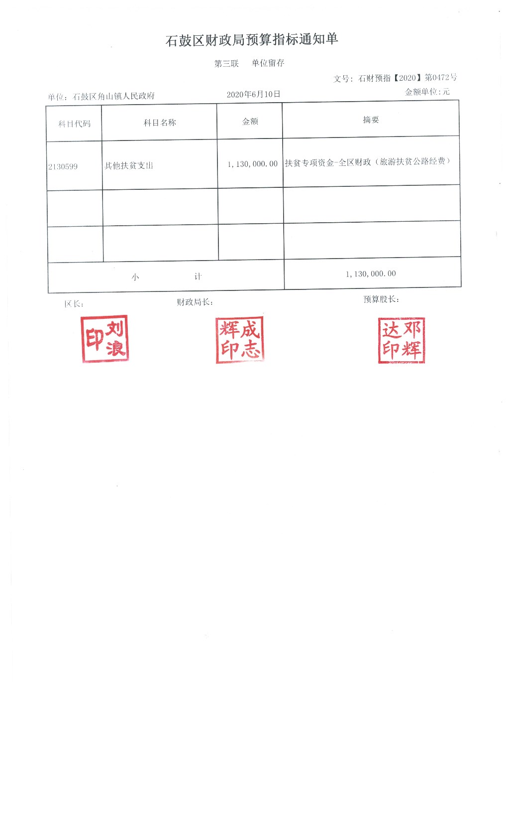 经角山镇申请,报区领导同意,现拨付113万元用于旅游扶贫公路建设,不得挪作他用。详见附件。