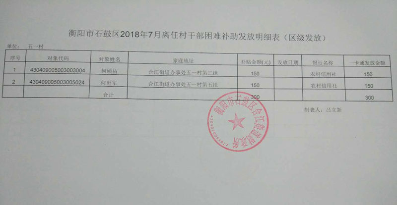 【合江街道】 衡阳市石鼓区五一村2018年7月离任村干部困难补助发放明细表(区级发放)