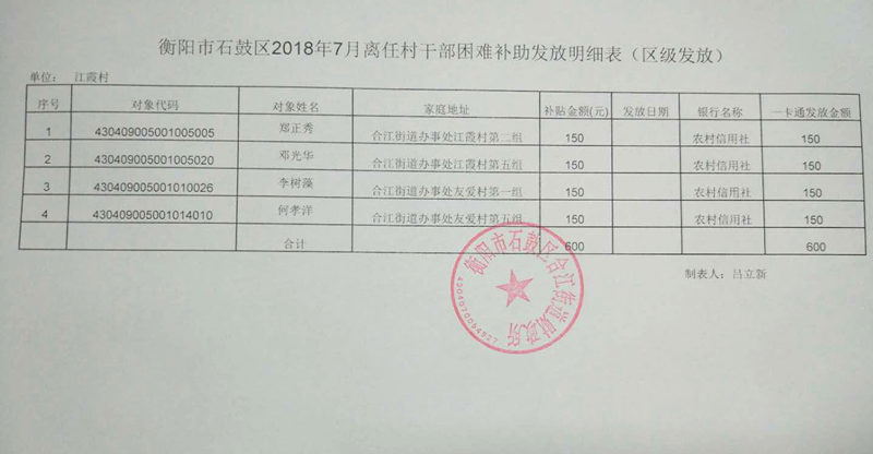【合江街道】 衡阳市石鼓区江霞村2018年7月离任村干部困难补助发放明细表(区级发放)