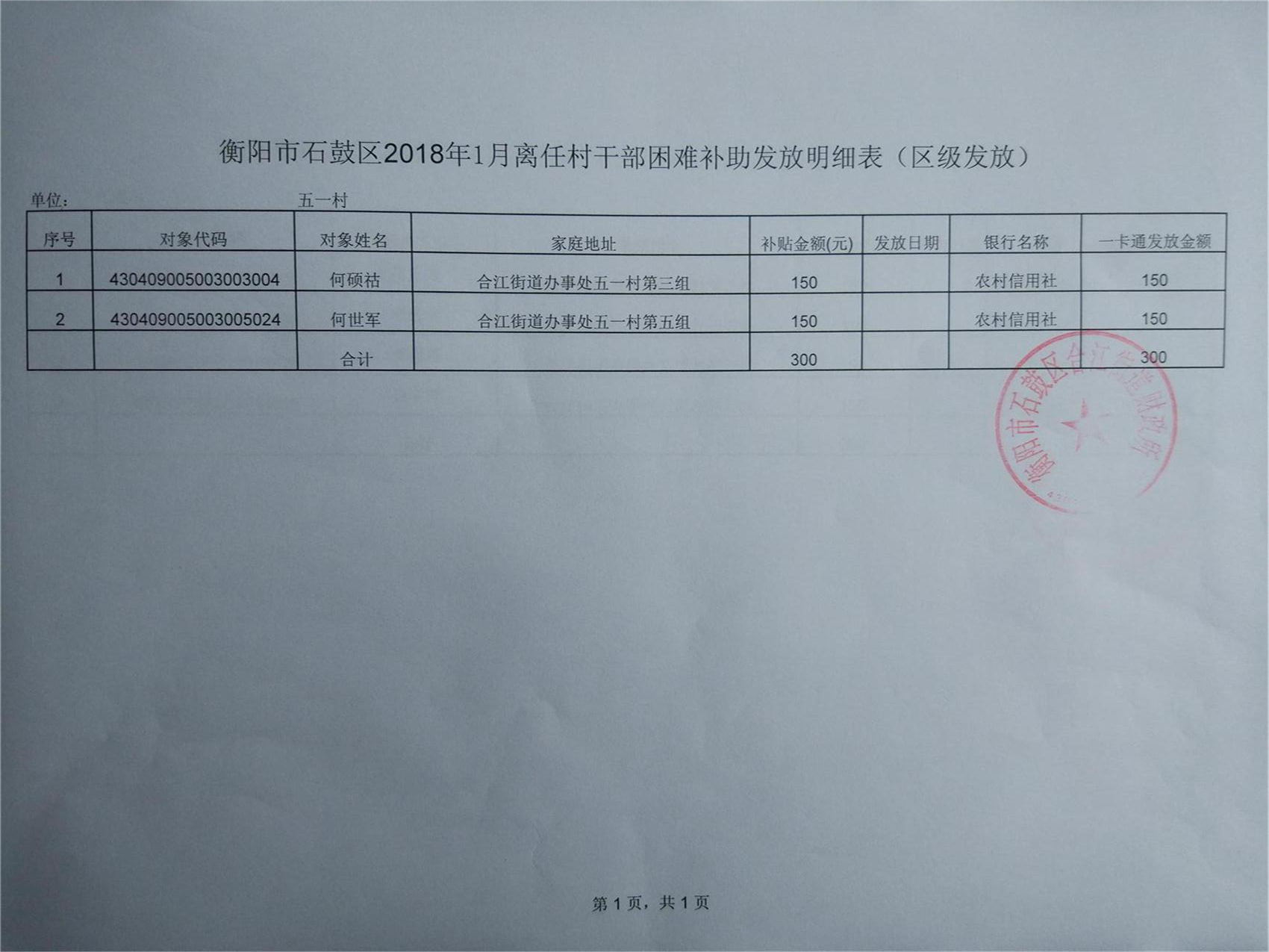 【合江街道】 衡阳市石鼓区合江街道五一村2018年1月离任村干部困难补助发放明细表(区级发放)