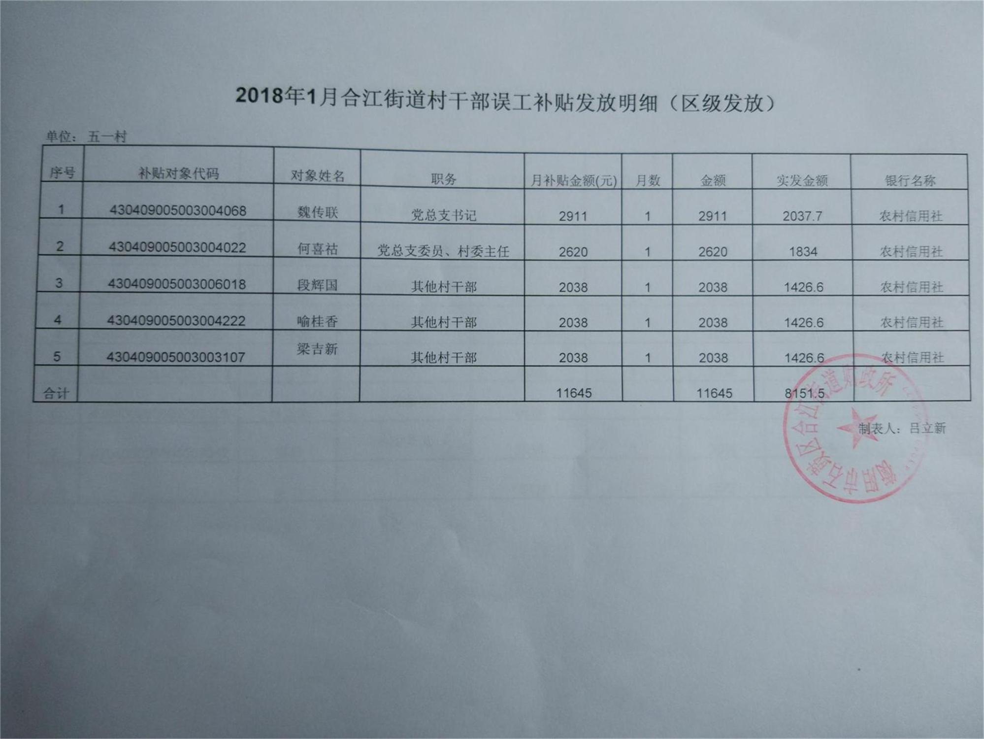 【合江街道】 2018年1月合江街道五一村村干部误工补贴发放明细(区级发放)