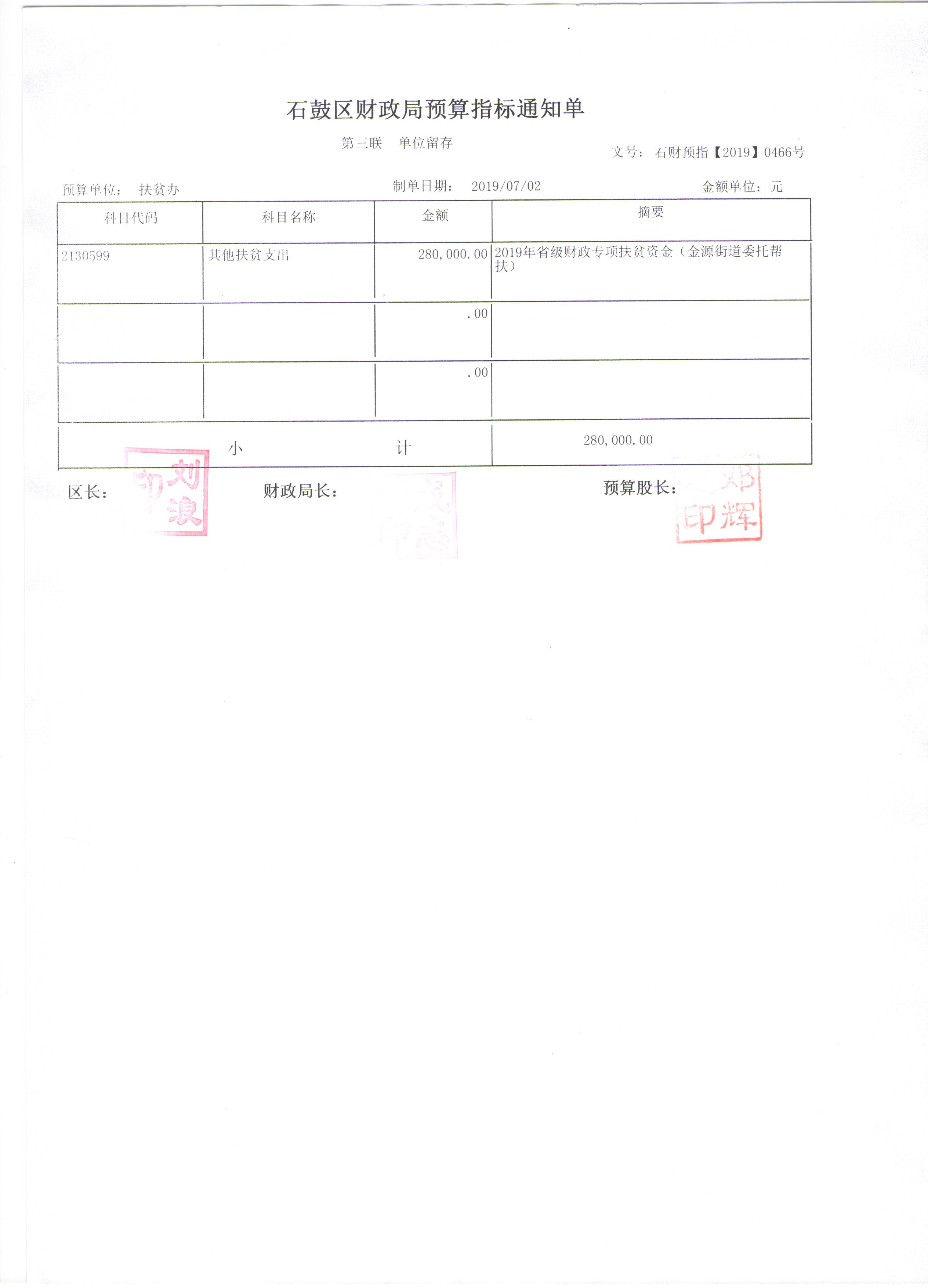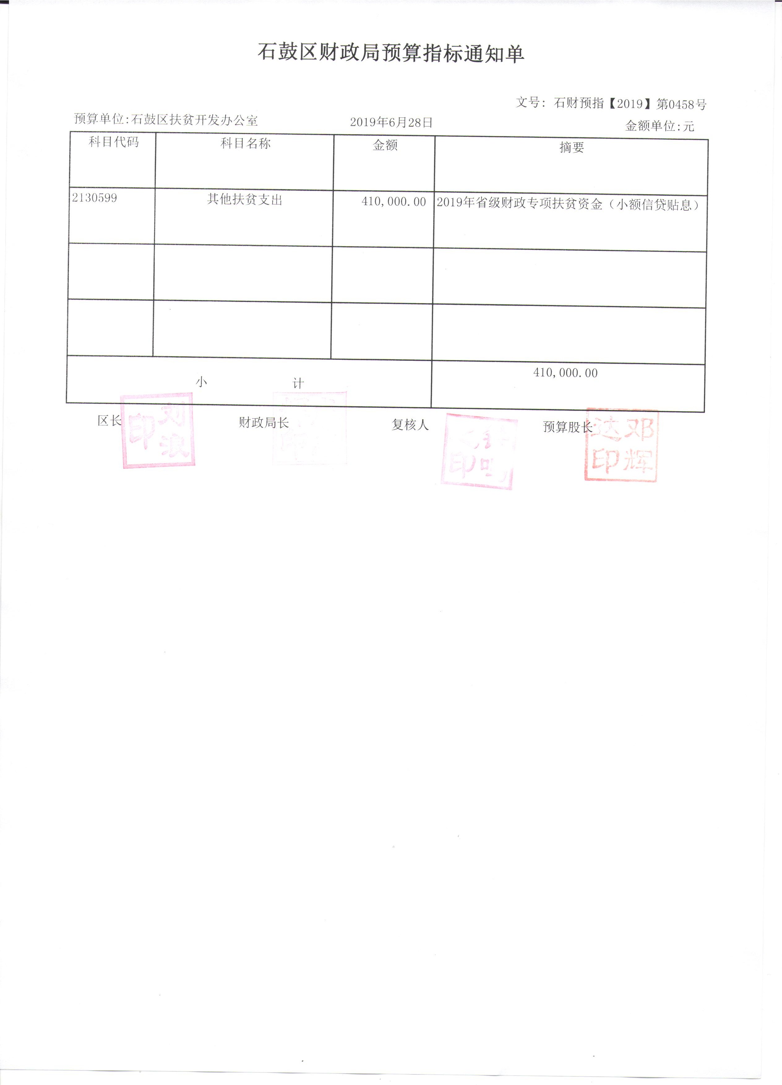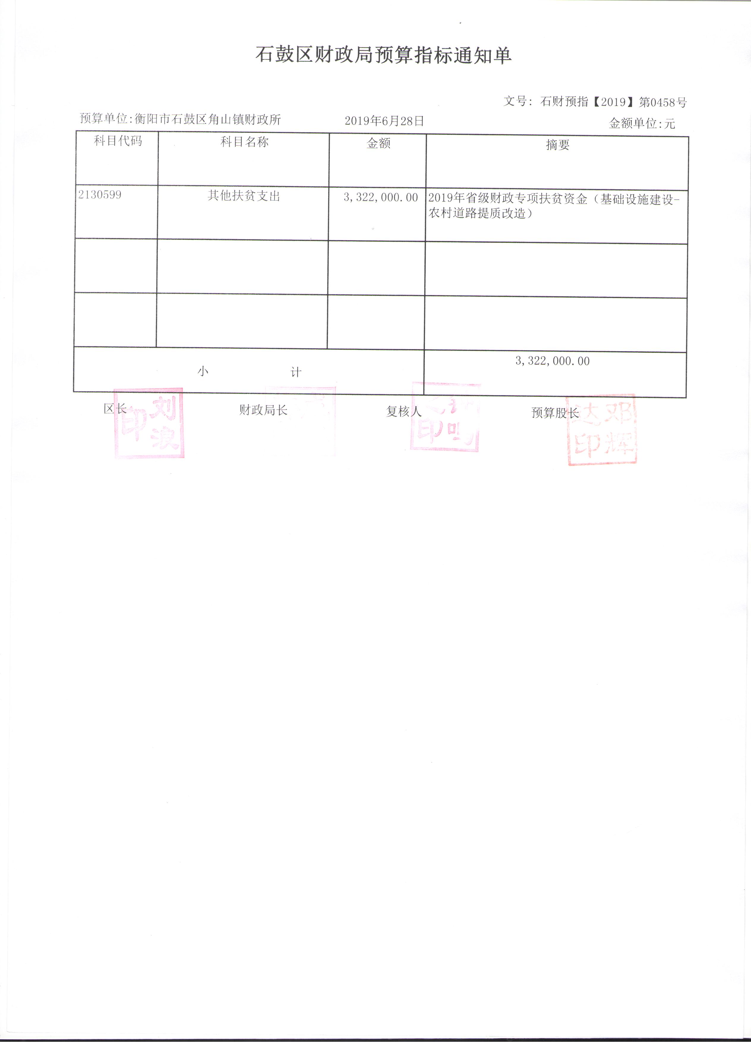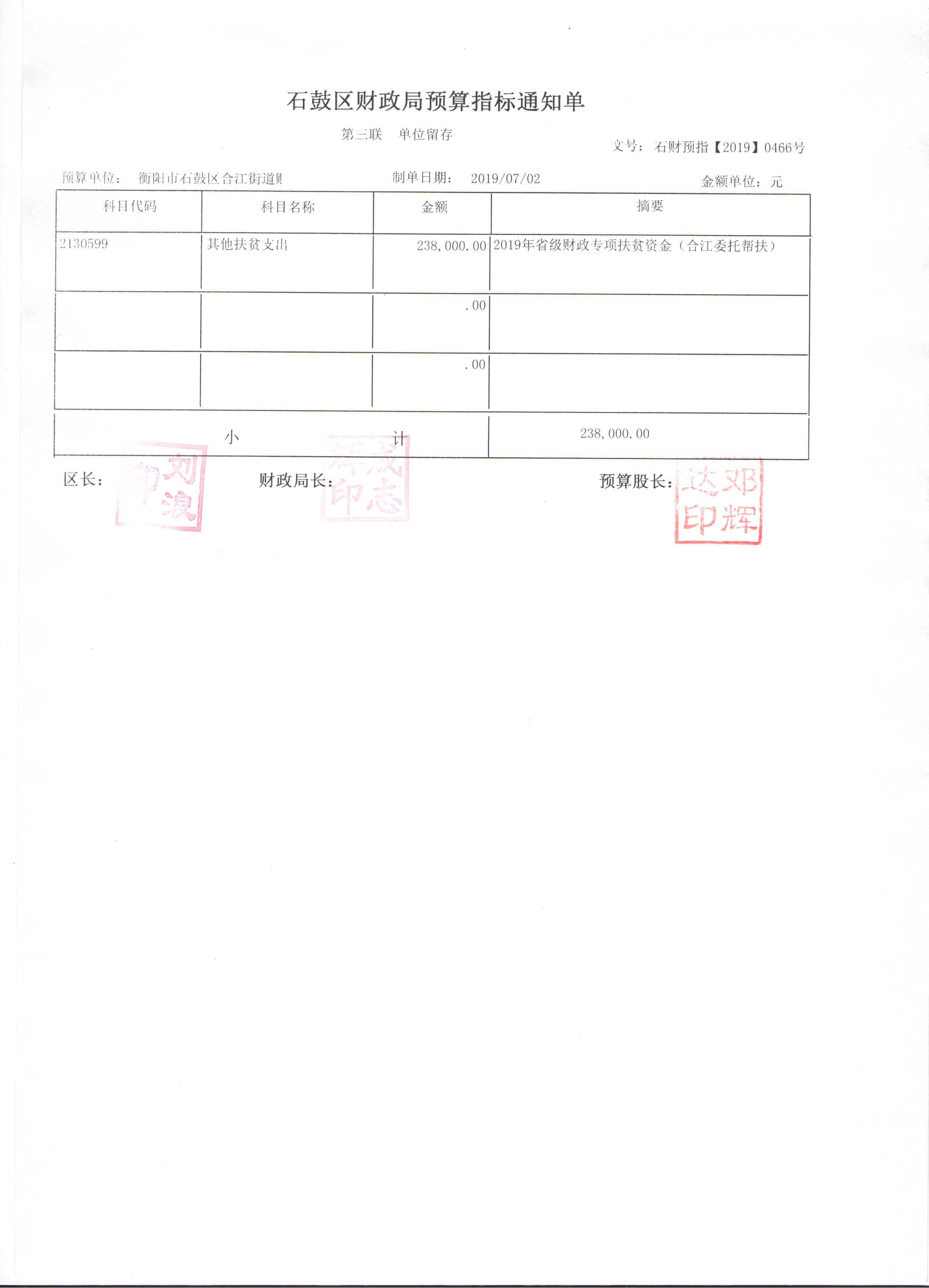 根据衡财预【2019】213号文件精神和区实际需要,报经区领导同意,特意下拨省级财政专项扶贫资金。以下是预算指标单: