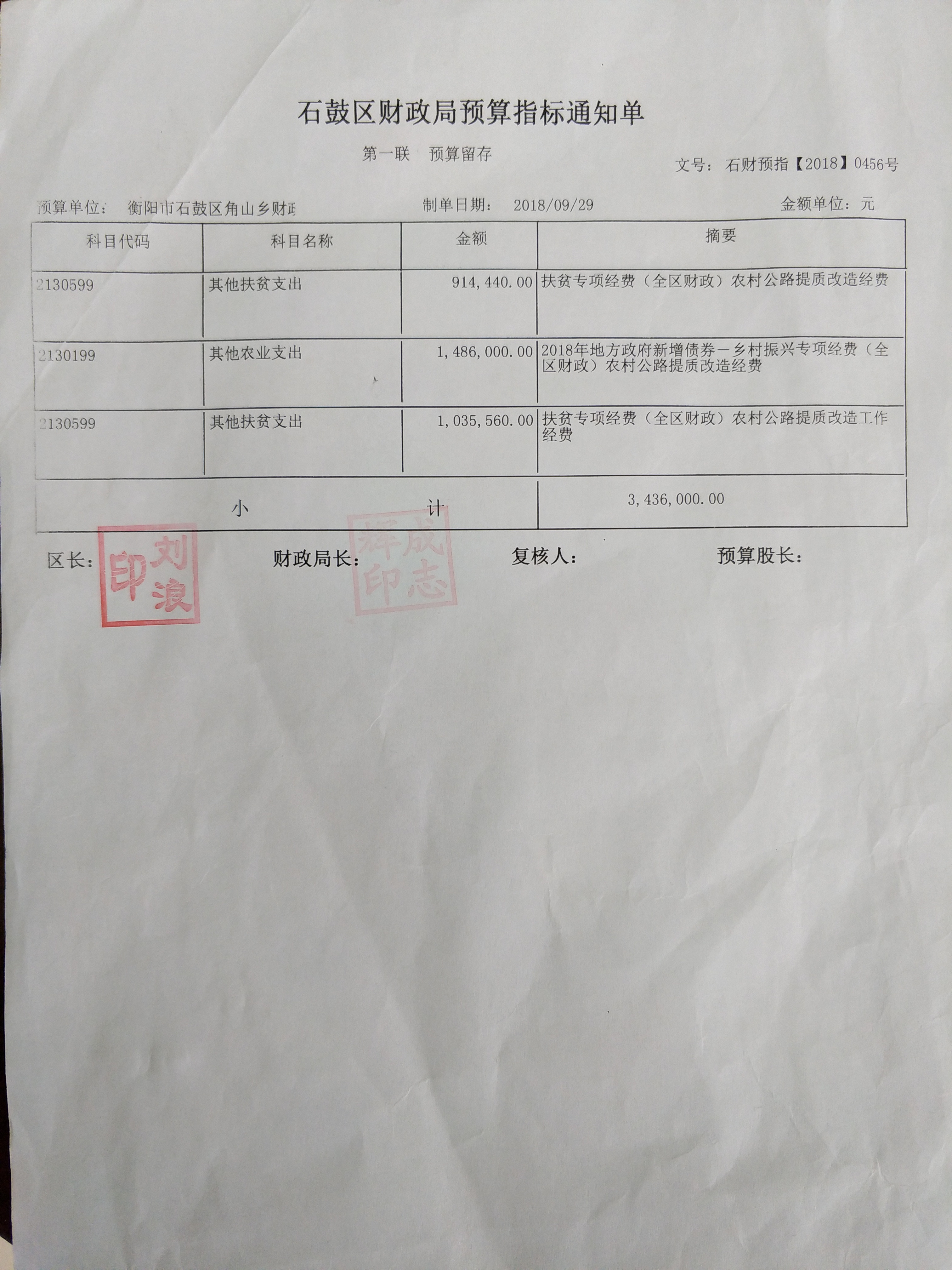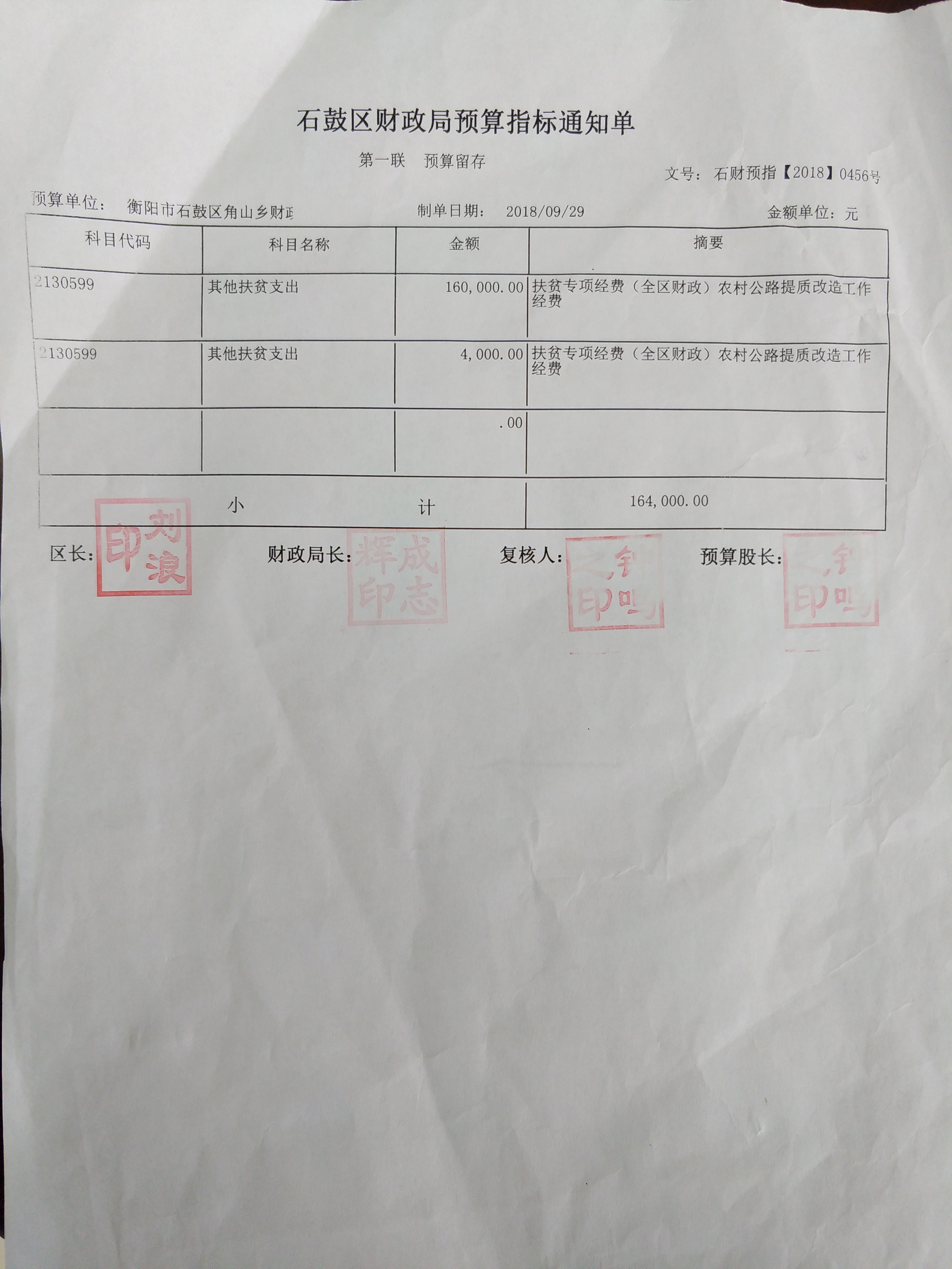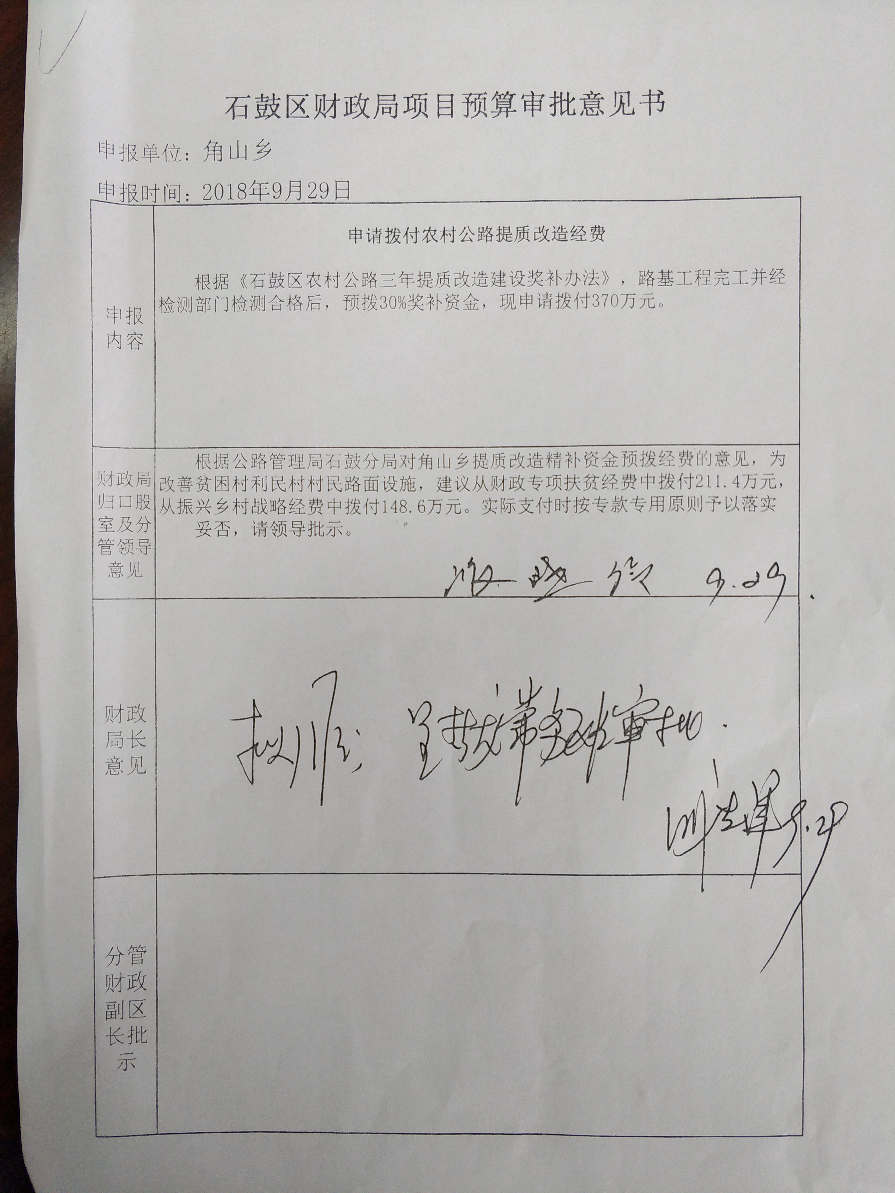 关于角山乡《申请拨付农村公路提质改造经费》预算审批意见书