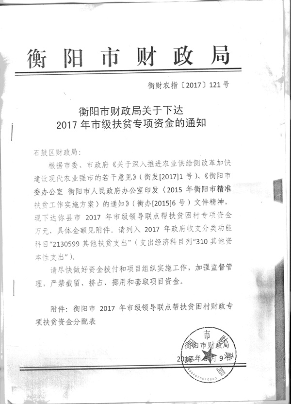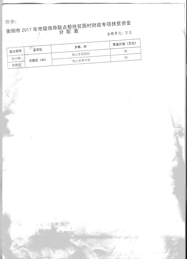 该项指标已于2017年6月13日下拨到角山乡财政所,主要用于扶贫项目,不得挪作他用。
