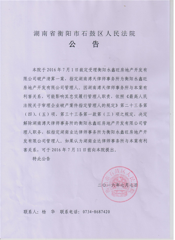 【区人民法院】 关于衡阳永鑫旺房地产开发有限公司破产清算案公告