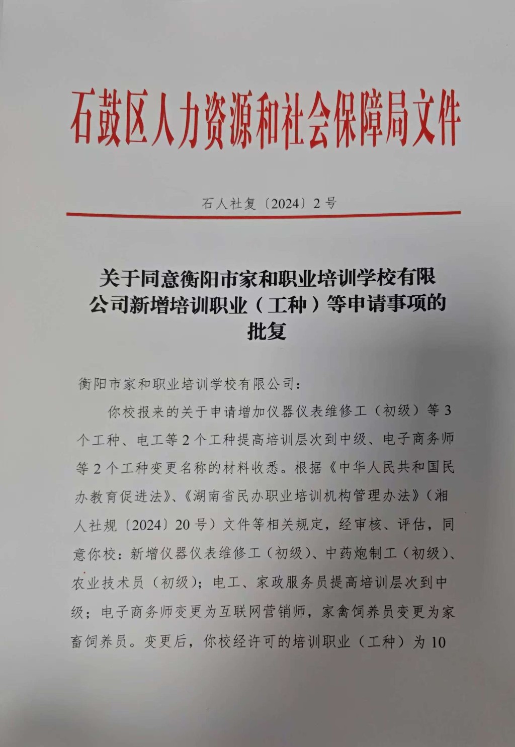 【区人社局】关于同意衡阳市家和职业培训学校有限公司新增培训职业(工种)等申请事项的批复