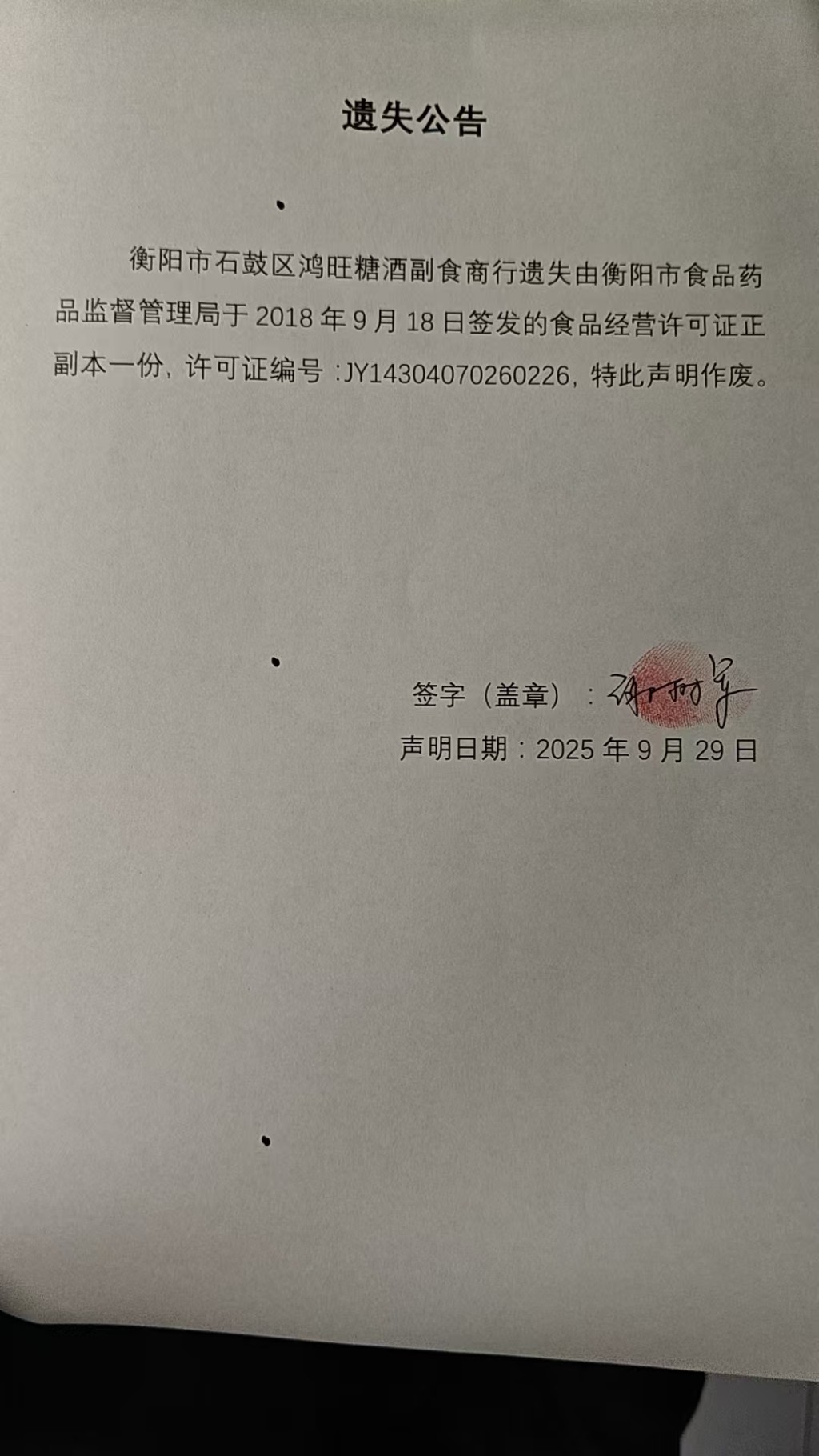 衡阳市石鼓区鸿旺糖酒副食商行遗失由衡阳市食品药品监督管理局于2018年9月18日签发的食品经营许可证正副本一份,许可证编号:JY14304070260226,特此声明作废。